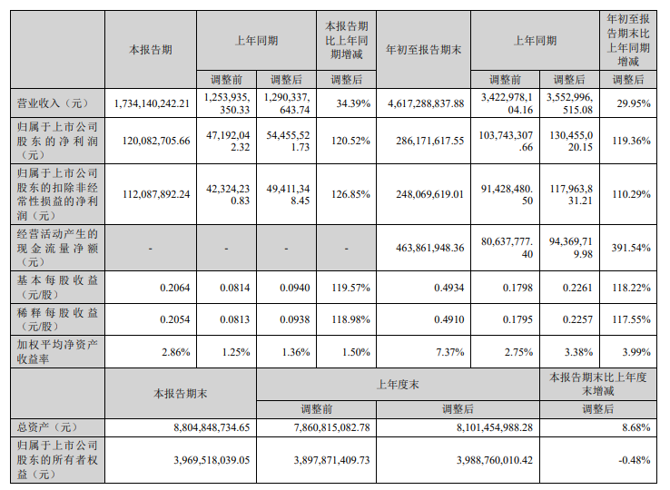 10月28日,飞荣达(300602)公告称,第三季度实现营业收入17.34亿元,同比增长34.39%;归属于上市公司股东的净利润为1.20亿元,同比增长120.52%。前三季度实现营业收入46.17亿元,同比增长29.95%;归属于上市公司股东的净利润为2.86亿元,同比增长119.36%。