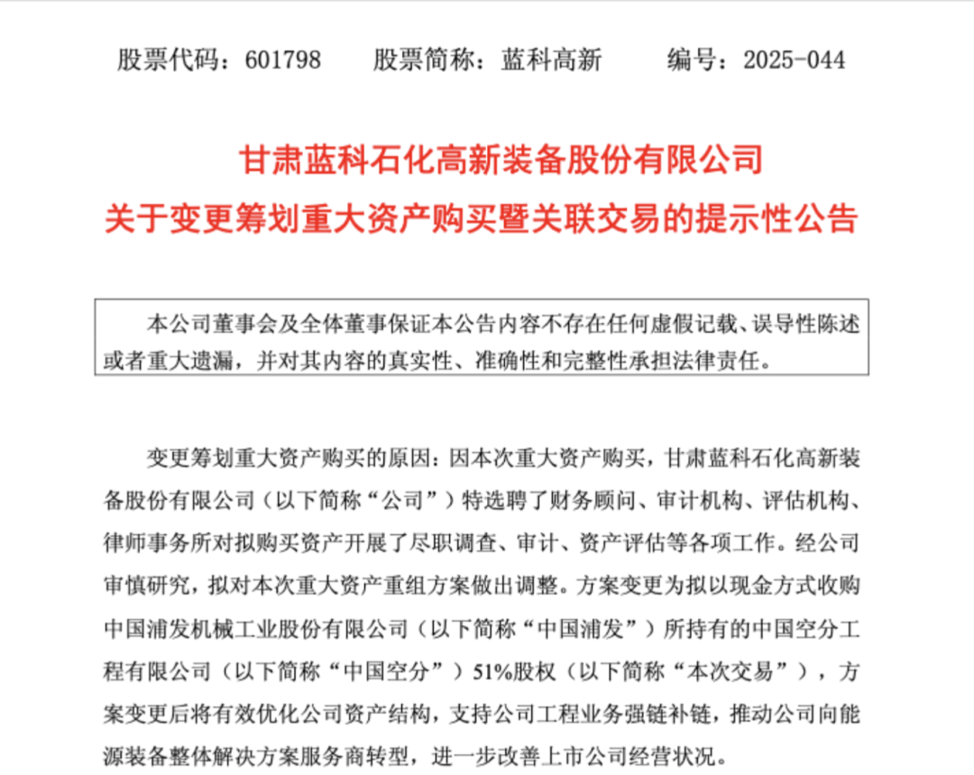 今年4月,蓝科高新发布公告称,拟筹划重大资产重组。在最新的公告中,公司表示,拟对本次重大资产重组方案做出调整,方案变更为拟以现金方式收购中国浦发所持有的中国空分51%股权,方案变更后将有效优化公司资产结构,支持公司工程业务强链补链,推动公司向能源装备整体解决方案服务商转型,进一步改善上市公司经营状况。与变更前的交易方案相比,本次交易事项减少了交易标的。