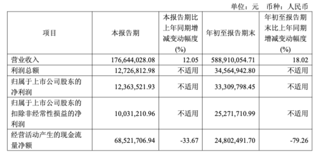 三季报显示,今年前三季度,公司实现营业收入5.89亿元,同比增长18.02%,实现归母净利润3330.98万元。