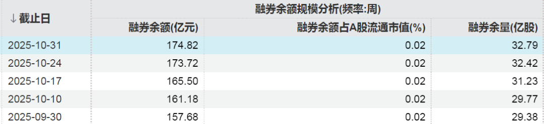 数据显示,截至10月31日,A股市场融券余额为174.82亿元,10月融券余额增加17.14亿元,融券余量为32.79亿股。