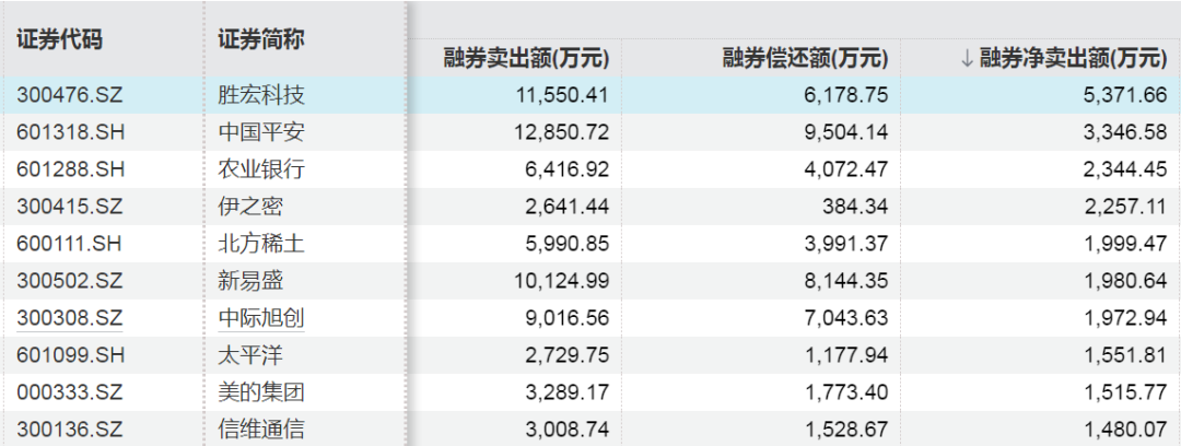 10月融券净卖出额居前的股票为胜宏科技、中国平安、农业银行(601288),分别为5371.66万元、3346.58万元、2344.45万元。
