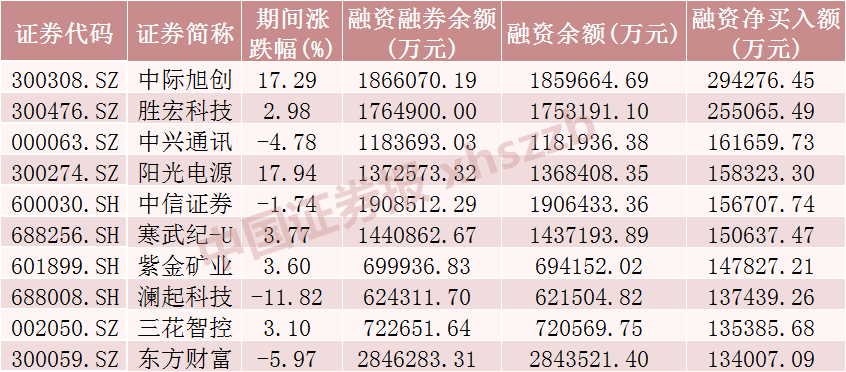 从个股情况来看,10月融资客对344只股票加仓金额超1亿元,加仓金额居前的10只股票分别为中际旭创、胜宏科技(300476)、中兴通讯(000063)、阳光电源(300274)、中信证券(600030)、寒武纪-U、紫金矿业(601899)、澜起科技、三花智控(002050)、东方财富(300059),分别净买入29.43亿元、25.51亿元、16.17亿元、15.83亿元、15.67亿元、15.06亿元、14.78亿元、13.74亿元、13.54亿元、13.40亿元。从市场表现上看,10月融资客加仓金额居前十的股票涨多跌少,涨幅最大的阳光电源涨近18%。