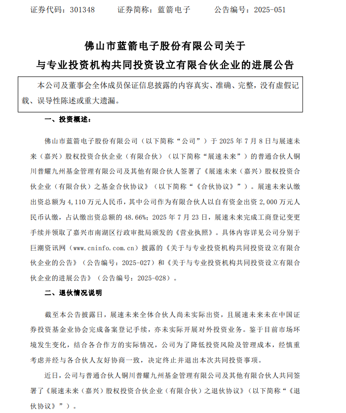 11月3日,蓝箭电子(301348)公告,公司此前公告与展速未来(嘉兴)股权投资合伙企业(有限合伙)(简称“展速未来”)的普通合伙人及其他有限合伙人签署了《展速未来(嘉兴)股权投资合伙企业(有限合伙)之基金合伙协议》。公司作为有限合伙人出资2000万元认缴,占比48.66%。鉴于目前市场环境发生变化,结合各合作方的实际情况,公司为了降低投资风险及管理成本,经慎重考虑并经与各合伙人友好协商一致,决定终止并退出本次共同投资事项。
