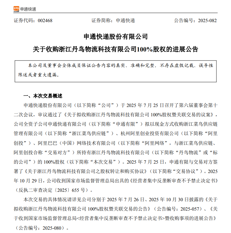 11月3日晚间,申通快递公告,公司全资子公司申通快递有限公司已完成收购浙江丹鸟物流科技有限公司100%股权的交割工作。丹鸟物流已办理完毕工商变更登记手续,并取得杭州市余杭区市场监督管理局换发的《营业执照》。本次交易不构成重大资产重组,不涉及关联交易,也不构成《上市公司重大资产重组管理办法》规定的重大资产重组。