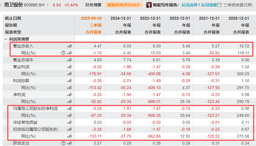 10月30日,南卫股份发布的三季度业绩公告显示,2025年前三季度营收约4.47亿元,同比减少1.7%;归母净利润为亏损2493万元,亏损额进一步扩大。