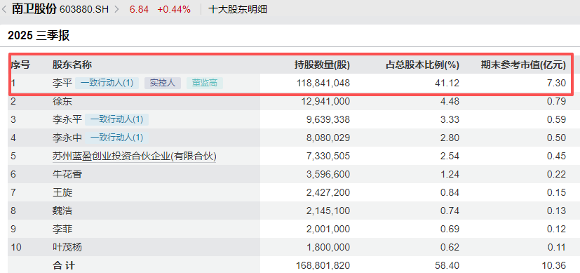 李平现年65岁,为南卫股份董事长、总经理。截至今年三季度末,李平为南卫股份的第一大股东,持股数量为1.19亿股,持股占比为41.12%。