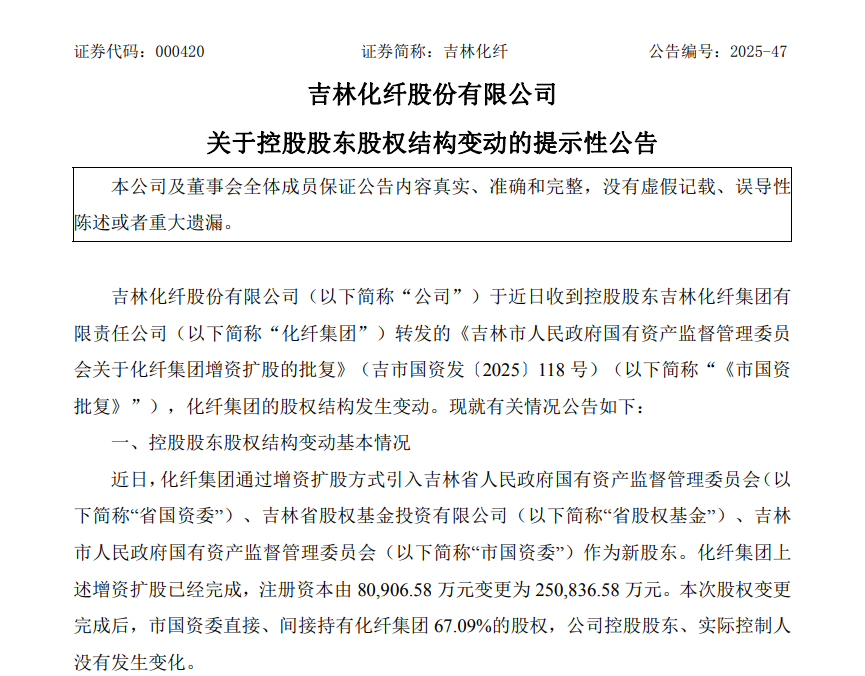 11月4日,吉林化纤(000420)公告称,近日,公司控股股东吉林化纤集团有限责任公司通过增资扩股方式引入吉林省人民政府国有资产监督管理委员会、吉林省股权基金投资有限公司、吉林市人民政府国有资产监督管理委员会作为新股东,注册资本由8.09亿元增至25.08亿元。本次股权变更完成后,市国资委直接、间接持有化纤集团67.09%的股权,公司控股股东、实际控制人未发生变化。