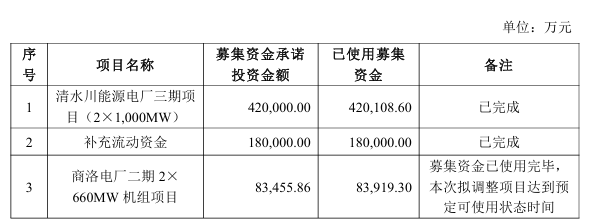 截至目前,商洛电厂二期2×660MW机组项目尚未完工。商洛电厂二期2×660MW机组项目推进过程中由于受到相关行政审批事项较原计划延后,导致建设时间推迟。因此,根据目前该募投项目的实际进展情况,在项目实施主体、实施方式、募集资金用途及项目投资总规模不发生变更的情况下,公司决定将商洛电厂二期2×660MW机组项目达到预定可使用状态的时间调整至2026年12月31日。