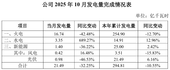 公司2025年1-10月累计完成发电量294.81亿千瓦时,同比降低10.55%。其中火电累计发电量同比降低12.70%,水电累计发电量同比增长12.96%,新能源累计发电量同比增长2.42%。