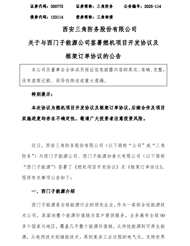 11月5日,三角防务(300775)公告称,公司与西门子能源公司、西门子能源加拿大有限公司签署了《燃机项目开发协议》及《框架订单协议》。开发协议使公司获得为西门子能源供应特定物项的资格,框架订单协议要求公司按照采购订单、工作说明书及图纸等文件要求,交付相应产品及工装。该协议有助于公司拓展国际市场业务,提升市场地位,但后续合作及项目实施进度存在不确定性,且年度具体采购金额尚不确定。