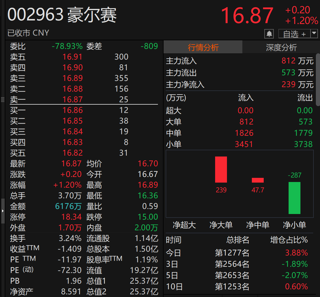 截至11月5日收盘,豪尔赛报16.87元/股,总市值为25.37亿元。