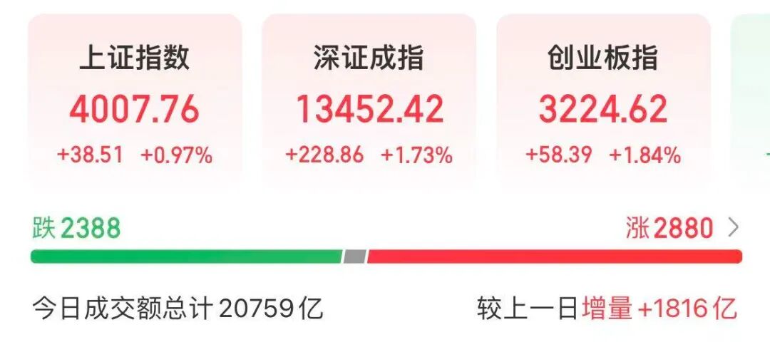 截至收盘,上证指数上涨0.97%,深证成指上涨1.73%,创业板指上涨1.84%。全天成交额20759亿元,较前一交易日增加1816亿元。全市场超2800只个股上涨。板块题材上,磷化工、工业金属、存储芯片、农化制品、CPO、电源设备板块涨幅居前;海南自贸区、冰雪产业、短剧游戏、零售、港口航运板块跌幅居前。