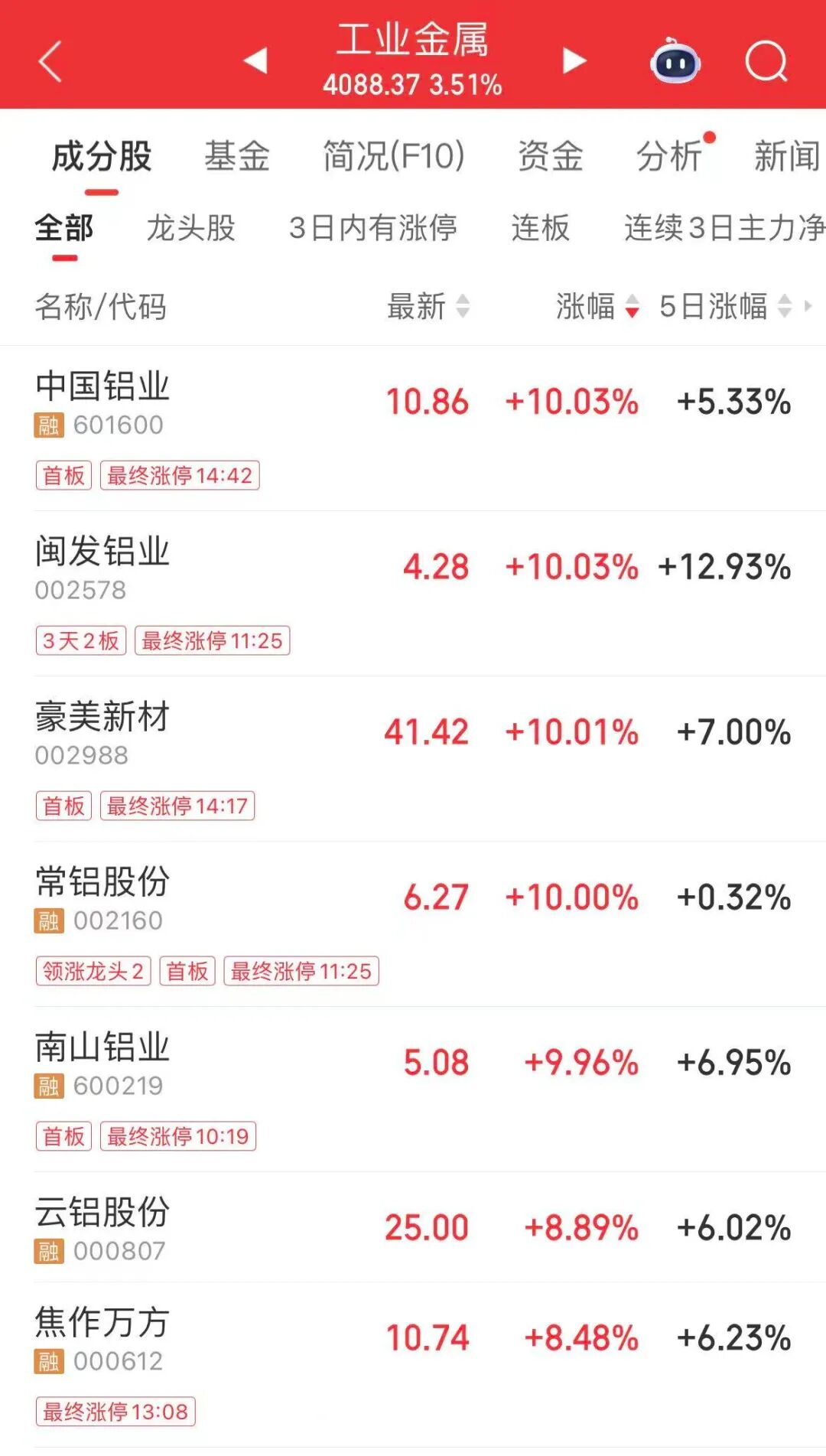 工业金属板块今天表现强势。其中,中国铝业、闽发铝业(002578)、豪美新材(002988)、常铝股份(002160)、南山铝业(600219)涨停,云铝股份(000807)、焦作万方(000612)涨超8%,神火股份(000933)涨超7%。