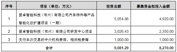 本次募集配套资金具体用途为:“爱卓智能科技(常州)有限公司汽车饰件等产品智能化改扩建项目(一期)”“爱卓智能科技(常州)有限公司研发中心项目”“支付本次交易的中介机构费用、相关税费等”。
