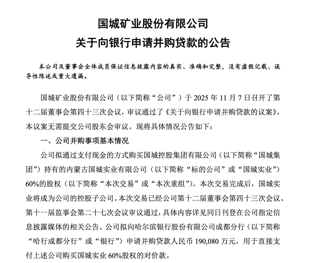 与此同时,国城矿业还发布了《关于向银行申请并购贷款的公告》,该公告提到,公司拟向哈尔滨银行股份有限公司成都分行申请并购贷款人民币19.008亿元,用于直接支付上述公司购买国城实业60%股权的对价款,贷款期限为84个月。