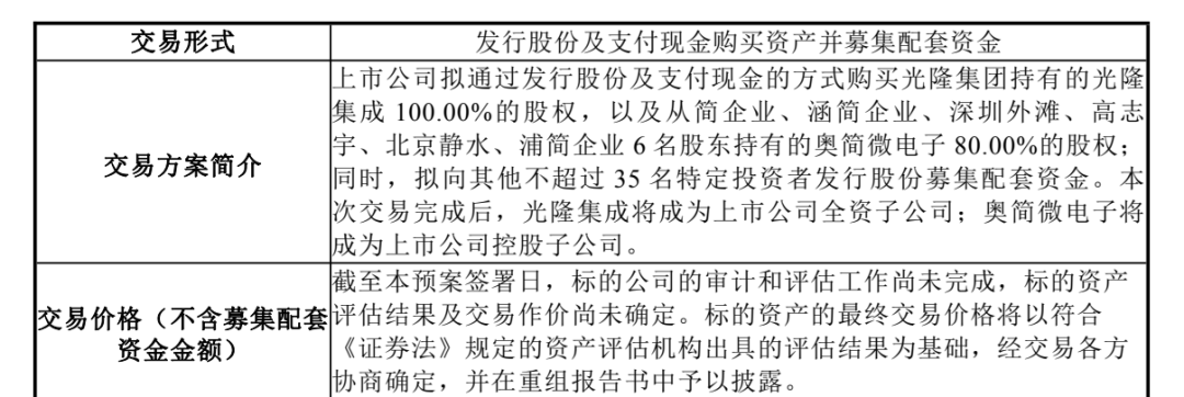 11月7日晚,英唐智控(300131)公告,公司拟通过发行股份及支付现金的方式购买光隆集团持有的光隆集成100%的股权,以及从简企业等持有的奥简微电子80%的股权;同时拟向其他不超过35名特定投资者发行股份募集配套资金。公司股票将于11月10日开市起复牌。