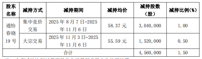 2025年8月7日至2025年11月6日,股东通怡春晓19号通过集中竞价交易方式减持3,040,000股股份,减持均价为58.37元;2025年11月3日至2025年11月6日,通怡春晓19号通过大宗交易方式减持1,520,000股股份,减持均价为55.59元。合计减持4,560,000股股份。