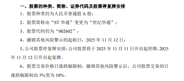 ST华通发布公告,公司关于撤销其他风险警示的申请已获得深圳证券交易所审核同意。根据《上市规则》的相关规定,公司股票将于2025年11月11日(星期二)开市起停牌一天,并于2025年11月12日(星期三)开市起复牌,股票简称将由“ST华通”变更为“世纪华通”,证券代码不变,仍为“002602”,撤销其他风险警示后,公司股票交易的日涨跌幅限制由5%变为10%。