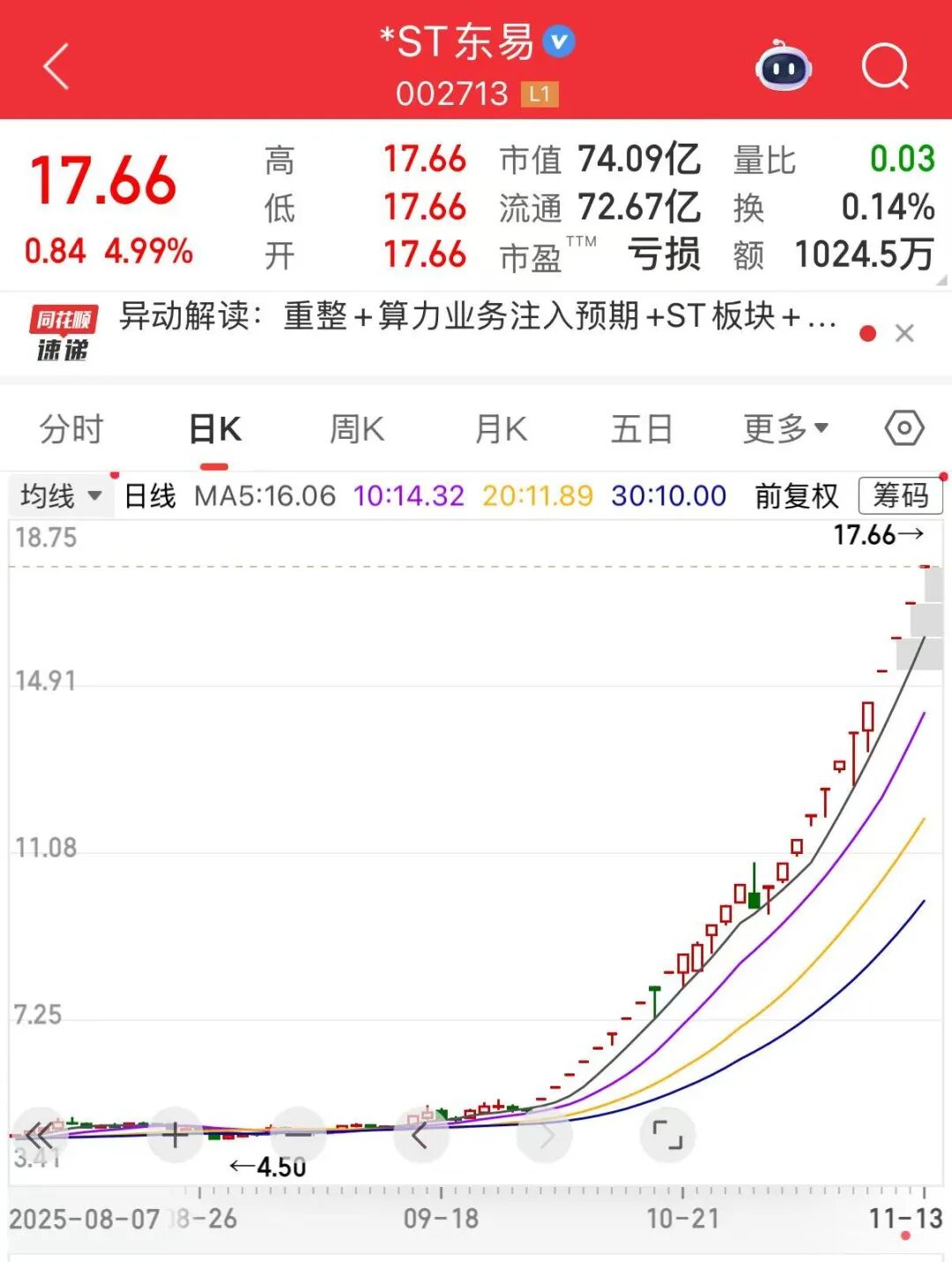 数据显示,截至11月13日收盘,*ST东易股价报17.66元/股,收获“12连板”。