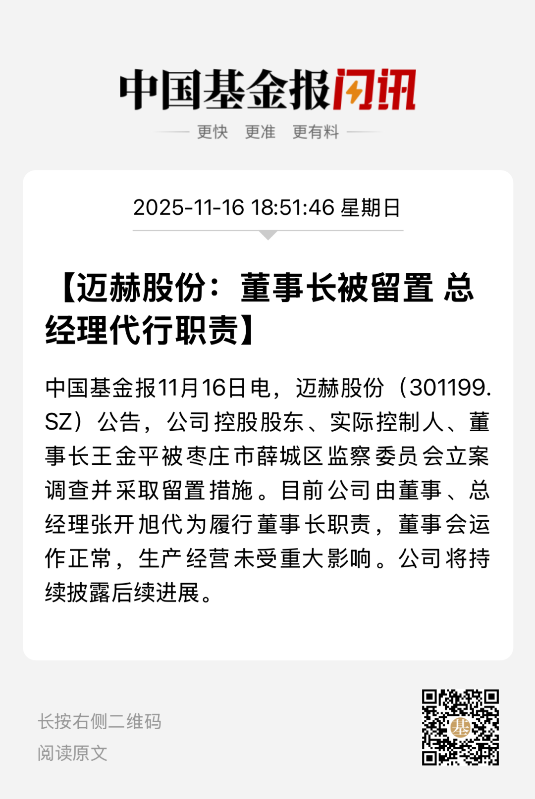 11月16日,迈赫股份(301199)公告称,公司于近日收到枣庄市薛城区监察委员会签发的《立案通知书》和《留置通知书》,公司控股股东、实际控制人、董事长王金平被立案调查并采取留置措施。在王金平被留置不能履行董事长职责期间,暂由公司董事、总经理、法定代表人张开旭代为履行公司董事长职责。公司日常经营管理由高管团队负责,其他董事、高级管理人员目前均正常履职。