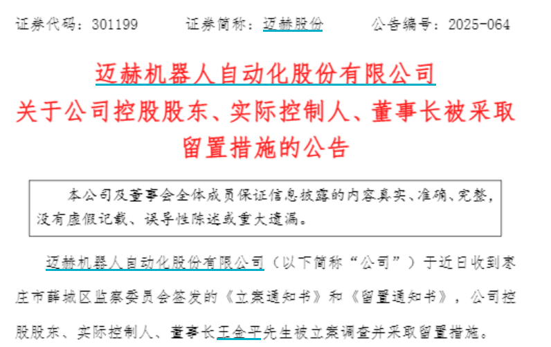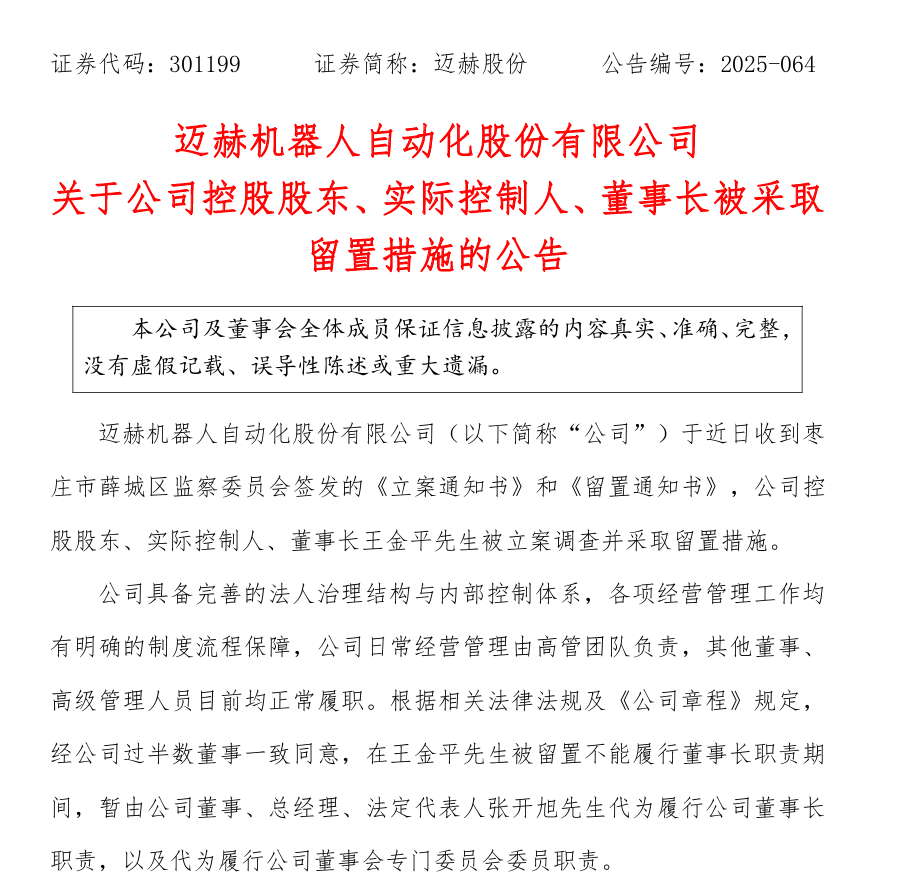 迈赫股份公告,公司近日收到枣庄市薛城区监察委员会签发的《立案通知书》和《留置通知书》,公司控股股东、实际控制人、董事长王金平先生被立案调查并采取留置措施。