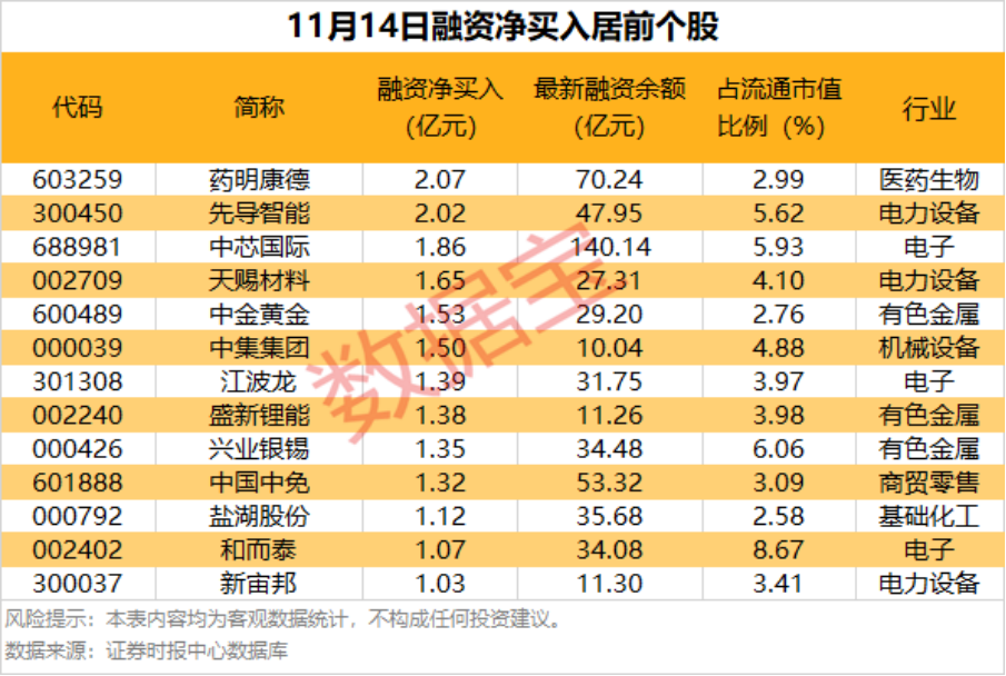 具体到个股,11月14日获融资净买入千万元以上的有377只,其中13只融资净买入额超1亿元。药明康德(603259)融资净买入额居首,当日净买入2.07亿元;其次是先导智能(300450)、中芯国际,融资净买入金额分别为2.02亿元、1.86亿元;融资净买入金额居前的还有天赐材料(002709)、中金黄金(600489)、中集集团(000039)等。