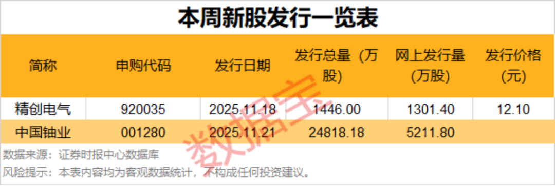 根据发行安排,本周暂有2只新股申购,本周二可申购精创电气,本周五可申购中国铀业(001280)。