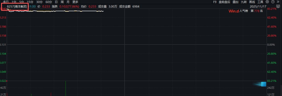 港股市场大幅波动的个股中,靖洋集团大涨,盘中涨幅一度超过80%。