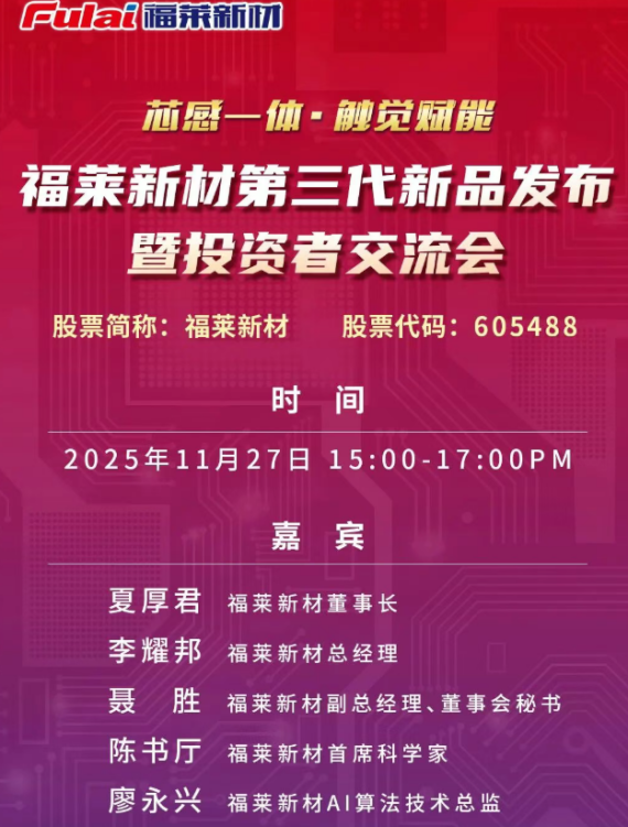 日前,福莱新材(605488)公众号推送新品发布会预告,拟于11月27日发布第三代柔性传感系统新品,该新品集柔性传感器、芯片、算法、大模型于一体,实现多项核心技术创新突破。