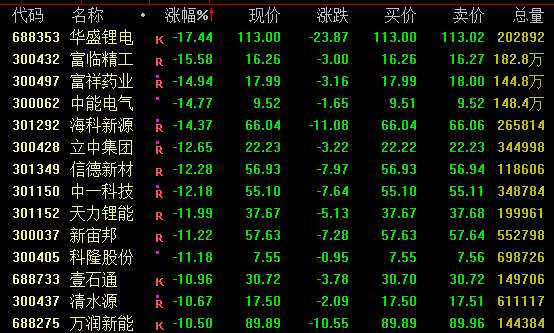 近日强势的锂电概念盘中大幅跳水,截至收盘,华盛锂电跌超17%,海科新源(301292)等跌超14%,信德新材(301349)、中一科技(301150)、天力锂能(301152)等跌超10%,石大胜华、天际股份、天赐材料、多氟多(002407)等跌停。