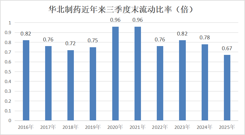 与有息债务水平持续高企相背离的是,公司的偿债能力却出现了下降的情况。数据显示,华北制药的流动比率为0.67倍,位居行业第六低水平,为公司近十年来同期最差水平;速动比率0.49倍,位居行业第十差水平,同样创出公司近十年来同期最差水平;现金比率不到0.13倍,位居行业第十差水平,也创出公司近十年来同期最差水平。