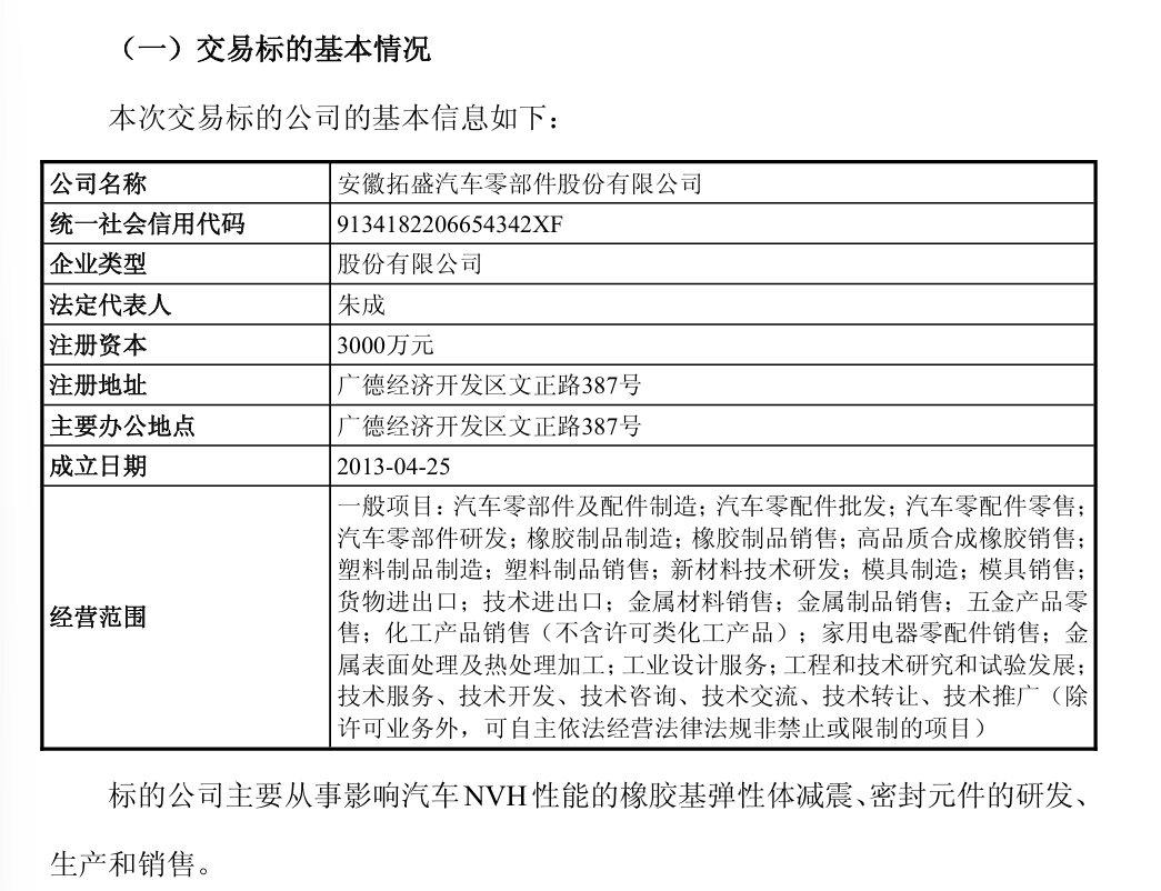 本次交易标的安徽拓盛成立于2013年4月,注册资本3000万元,核心业务聚焦影响汽车NVH(噪声、振动与声振粗糙度)性能的橡胶基弹性体减震、密封元件(881270)的研发、生产和销售,经营范围涵盖汽车零部件(881126)制造、橡胶制品(881266)研发销售、货物及技术进出口等多个领域。