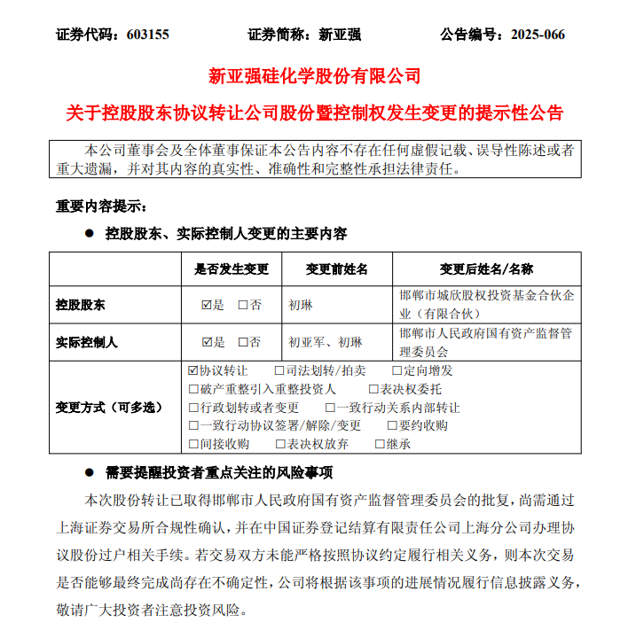 11月25日晚,新亚强(603155)公告称,公司控股股东、实际控制人之一初琳与邯郸市城欣股权投资基金合伙企业(有限合伙)(简称“城欣基金”)于11月24日签署股份转让协议。转让完成后,公司实际控制人将由初亚军、初琳变更为邯郸市人民政府国有资产监督管理委员会。11月25日,新亚强(603155)股票开盘后即封涨停板。