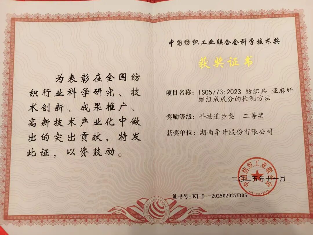 11月28日,中国纺织工业联合会科学技术奖励大会在北京人民大会堂隆重举行。东华大学牵头,华升股份(600156)等单位共同参与完成的《ISO5773:2023纺织品亚麻纤维组成成分的检测方法》项目,荣获“中国纺织工业联合会科技进步奖二等奖”。