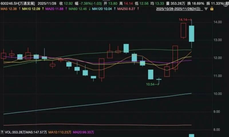 近期A股市场整体走势震荡,万通发展(600246)(600246.SH)却走出了独立行情。截至11月27日数据显示,该股近一个月累计涨幅超过22%,其中近两个交易日连续涨停,累计涨幅达19.99%。然而,市场的热烈情绪在11月28日出现明显降温,当日其股价下跌7.38%,收盘报12.92元,显示资金态度正趋于分化。
