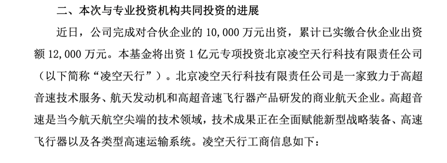 不过在11月25日,通宇通讯发布公告称,其与专业投资机构共同设立的“广东通宇华真空天产业基金合伙企业(有限合伙)”,将出资1亿元专项投资北京凌空天行科技有限责任公司 (下称“凌空天行”)。