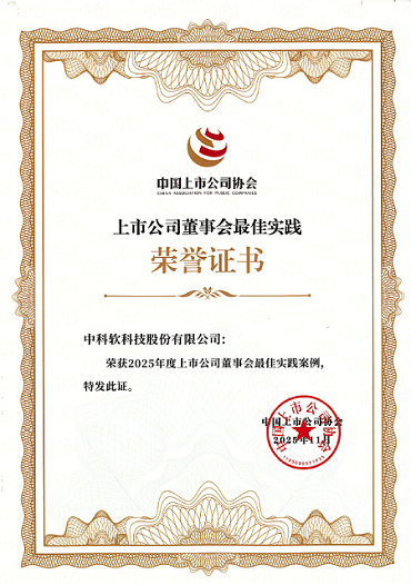 “2025上市公司董事会最佳实践案例”评选由中国上市公司协会主办,是国内资本市场具有权威性的公司治理奖项之一。该评选旨在推动上市公司董事会规范运作、提升治理效能。经过严格的初审、专家评审及诚信核查,中科软成功跻身“最佳实践案例”之列,证明公司在战略引领、投资者关系管理、内控建设及ESG实践等方面的成效获得了权威机构的高度认可。