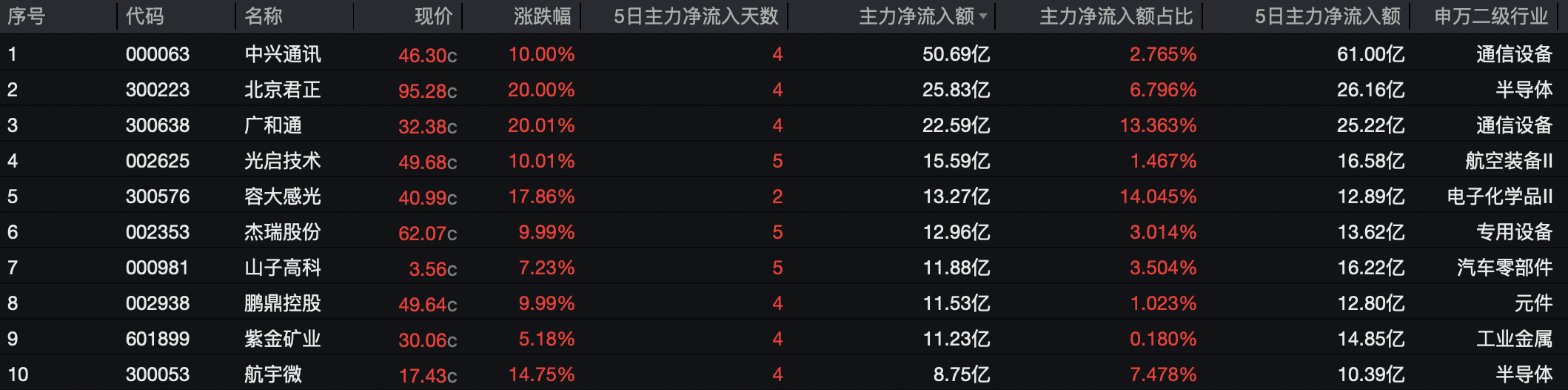 上证报中国证券网讯(记者 窦世平)数据显示,12月1日,当日主力资金净流入额排名前十个股包括中兴通讯、北京君正(300223)、广和通(300638)、光启技术(002625)、容大感光(300576)、杰瑞股份(002353)、山子高科(000981)、鹏鼎控股(002938)、紫金矿业(601899)、航宇微(300053)。净流入金额均超8亿元,最高为中兴通讯,净流入额超50亿元。其中,中兴通讯、北京君正、广和通、航宇微等属于通信设备或半导体板块,两个板块当日资金流入均超70亿元。