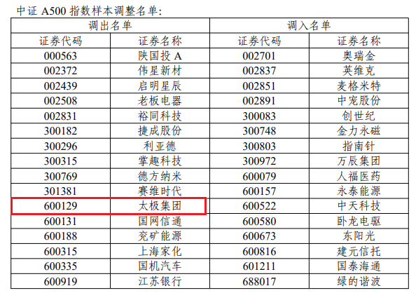 中证A500指数样本调整名单显示,太极集团(600129)(600129.SH)为中证A500指数样本调出样本之一。