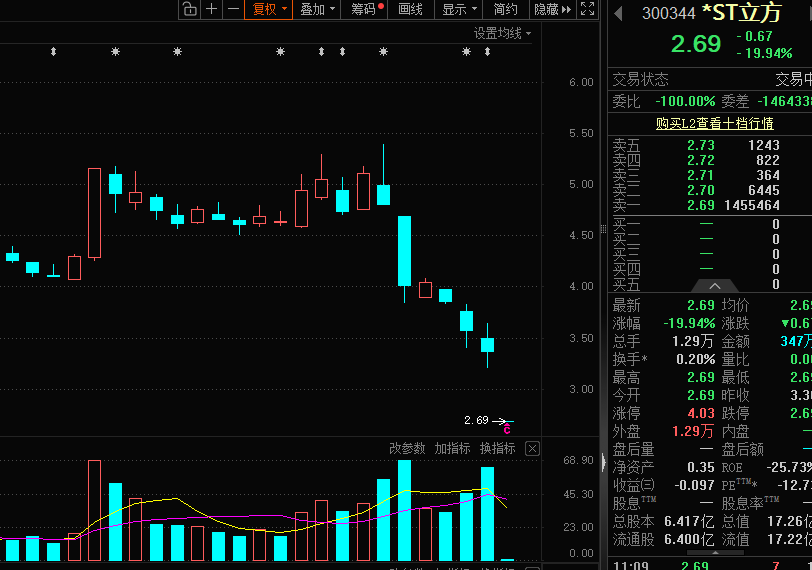 12月2日,ST立方(300344)复牌一字跌停,盘中跌停板封单超过145万手。目前公司股价为2.69元/股,逼近历史低点。