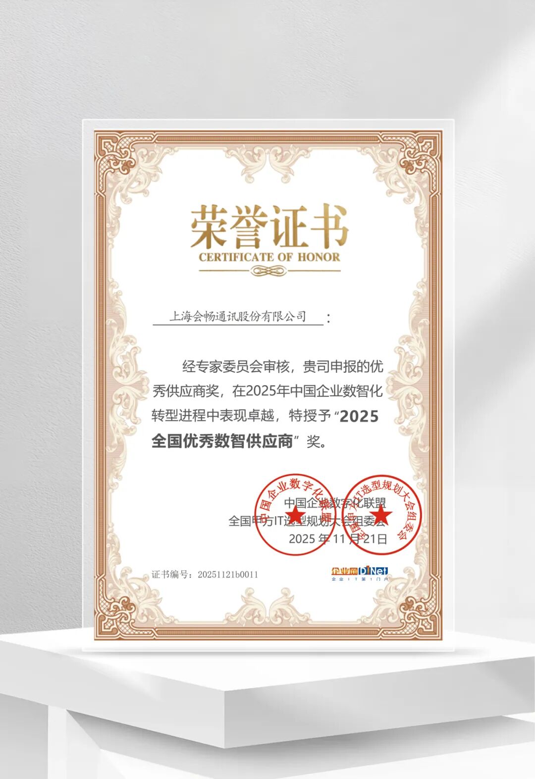 近日,凭借在智能通讯领域卓越的整体解决方案与前瞻性的AI技术创新,会畅通讯(300578)在众多参评企业中脱颖而出,荣获“2025全国甲方IT选型规划大会”颁发的“2025全国优秀数智供应商”奖项。此奖项是数智化转型领域的权威风向标,影响力覆盖甲方选型决策、行业技术趋势引导等关键维度,是行业权威对会畅通讯技术实力与市场贡献的高度认可,更彰显了会畅通讯在智能通讯领域的技术积累与核心价值。