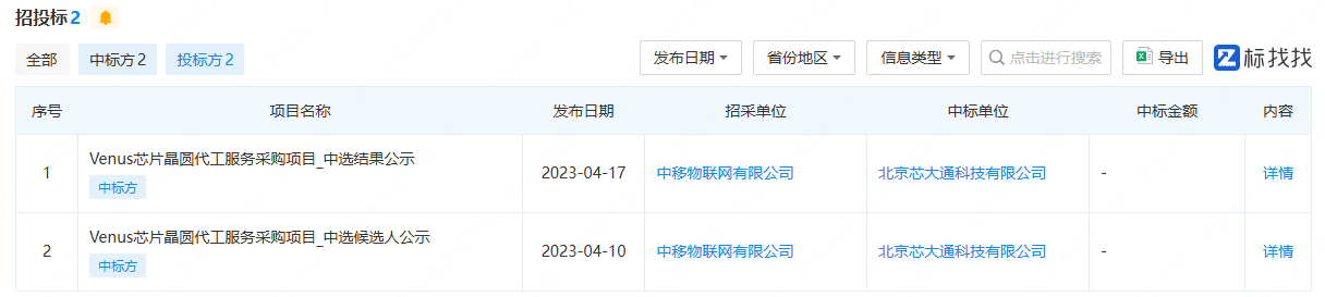 据企查查披露的企业招投标信息,芯大通仅在2023年有中标记录,中标项目为“Venus芯片晶圆代工服务采购项目”,招采单位为中移物联网有限公司,该公司为中国移动(600941)通信有限公司全资持股。
