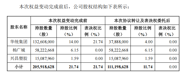 据高乐股份公告,此次权益变动前,华统集团、杨广城、兴昌塑胶五金厂有限公司分别持有上市公司14.00%、6.15%和1.59%的股份,这合计21.74%对应的表决权,全部由华统集团行使。