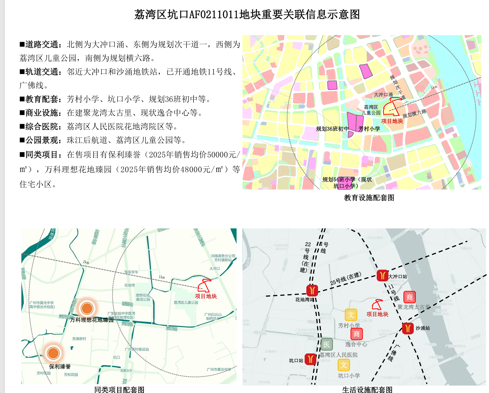 从区位来看,该地块位于白鹅潭核心的聚龙湾片区,地块西侧与荔湾区儿童公园相邻,距地铁11号线大冲口站仅约400米,同时离计划本月底正式开放的聚龙湾太古里商业综合体也只有约700米。地块周边在售项目有保利瑧誉、万科理想花地臻园等,销售均价为48000元/㎡至50000元/㎡不等。