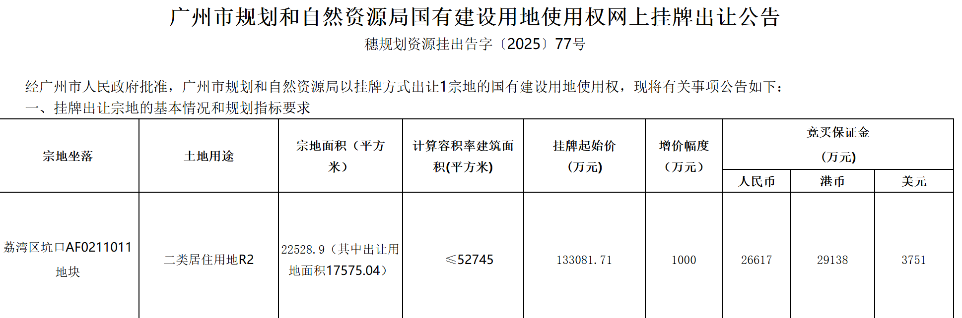 出让公告显示,荔湾区坑口AF0211011地块为二类居住用地,宗地面积为22528.9平方米,其中出让用地面积17575.04平方米,计算容积率建筑面积≤52745 平方米,容积率3.5。