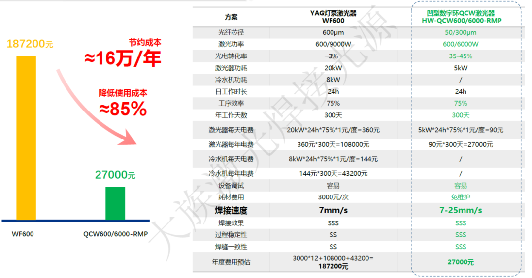 对比传统的高功率YAG激光器,光电转换效率提升至40%左右,在满负荷工况下使用成本降低85%。相较于常规环形光激光器,平均功率仅为其10%,能耗低至30%,在实现高性能焊接的同时践行绿色制造理念。