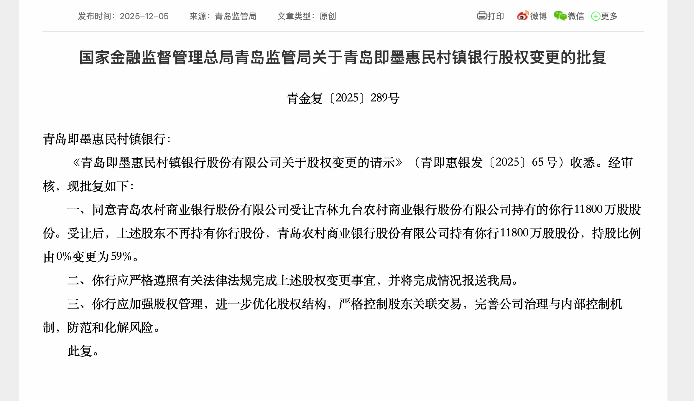 上证报中国证券网讯(记者 徐潇潇)12月5日,记者获悉,国家金融监督管理总局青岛监管局批复了《青岛即墨惠民村镇银行股份有限公司关于股权变更的请示》,同意青岛农村商业银行股份有限公司受让吉林九台农村商业银行股份有限公司持有的该行11800万股股份。受让后,上述股东不再持有该行股份,青岛农村商业银行股份有限公司持有该行11800万股股份,持股比例由0%变更为59%。