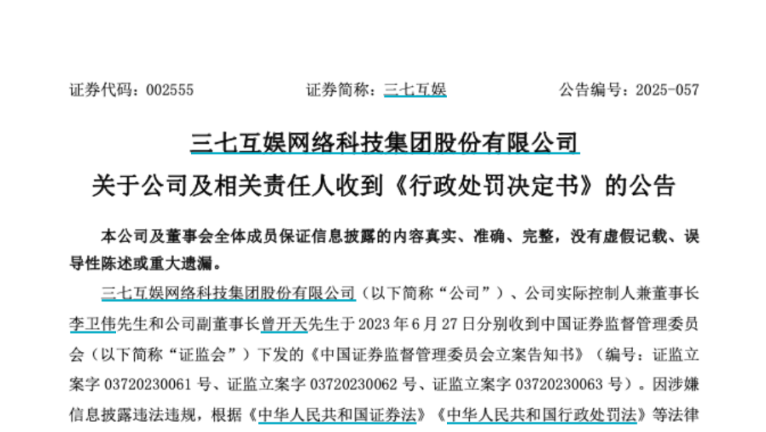 2023年6月,因涉嫌信息披露违法违规,三七互娱、公司实际控制人兼董事长李卫伟和副董事长曾开天均被证监会立案。