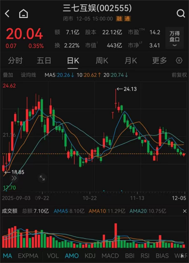 截至12月5日收盘,三七互娱每股报20.04元,较11月初的高点下跌超10%,公司最新市值为443亿元。