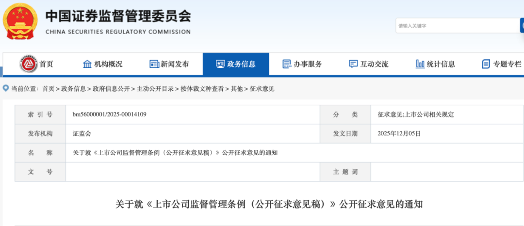 12月5日,中国证监会发布《上市公司监督管理条例(公开征求意见稿)》。